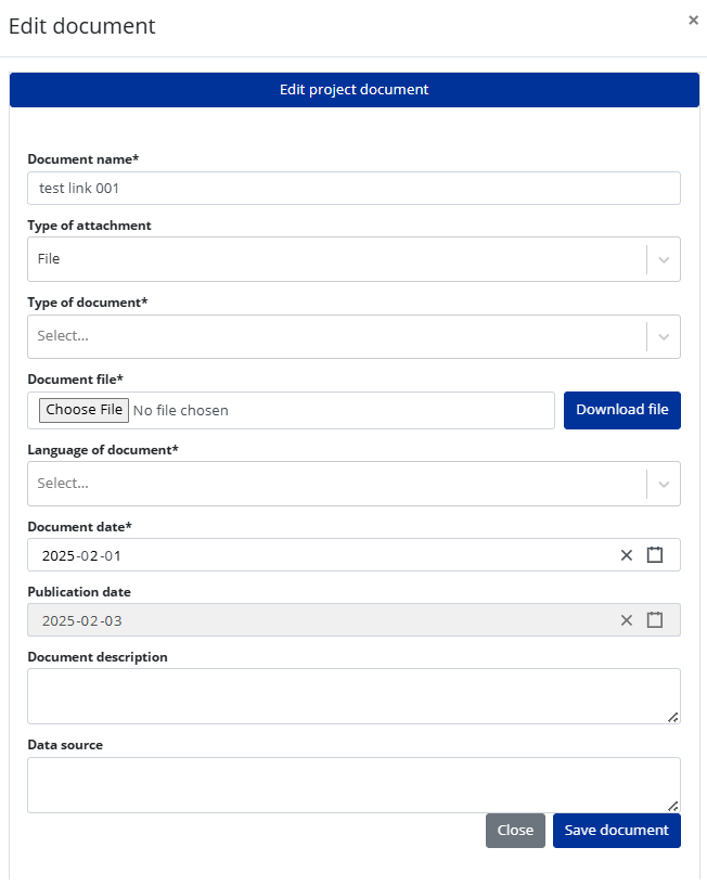 Moreover, the form includes two non-mandatory fields: ‘Document description’ and ‘Data source’.