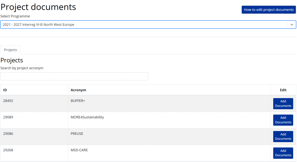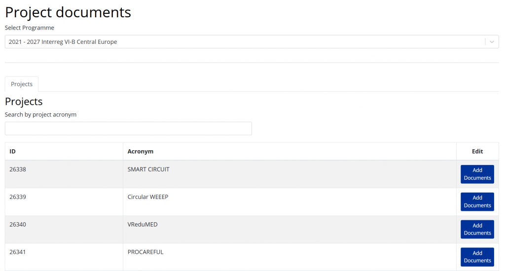After the selection, the list of projects belonging to the programme in keep.eu will appear.